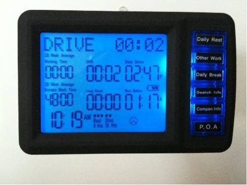 At the start of the working day the Hour Guard ® will only allow you to end your rest period if you have successfully completed your 9 or 11 hr rest requirement, from starting working you simply press the same button as you would on your tachograph. The Hour Guard ® will then record the total driving time, other work, or periods of availability and display on the screen what time you must stop for a break, it permits you to take 1 x 15 minute break and or 30 minute breaks and ensures that all break requirements are met with on screen warnings as the time for a break approaches.